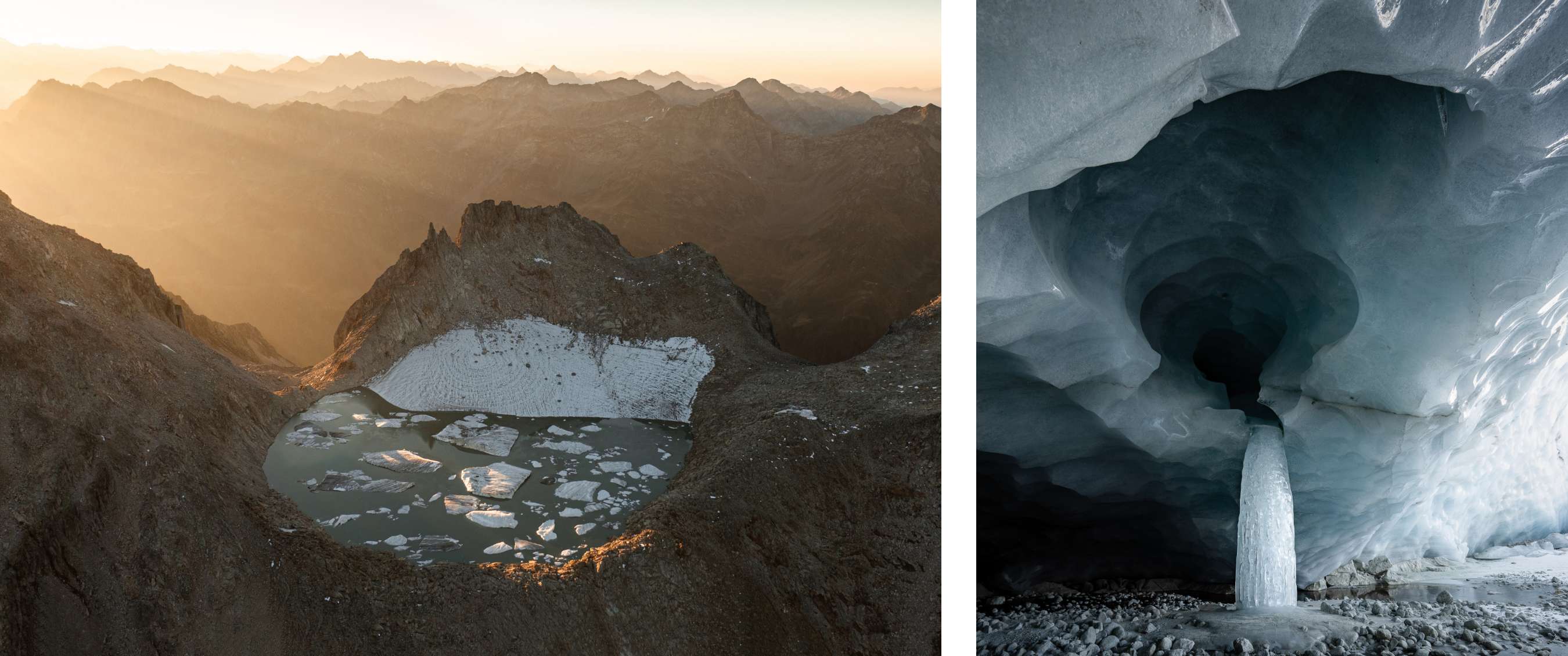 Enkele maanden later, dit keer in de Alpen, maakten de gletsjers opnieuw een diepe indruk. Tijdens zijn wandelingen kon hij er heel dicht bij komen en met eigen ogen zien hoe slecht ze eraan toe zijn: “Je ziet het ijs voor je ogen smelten. Het smeltwater druppelt niet, het stroomt. Alsof iemand ergens binnenin de kraan open heeft laten staan. Dat aftakelingsproces vind ik enorm confronterend. Voor mij zit er ‘ijs’ in paradijs, want gletsjers zijn onwaarschijnlijk mooi. Ze zijn de kroonjuwelen van het hooggebergte en het zou zonde zijn als ze daadwerkelijk zouden verdwijnen.”
